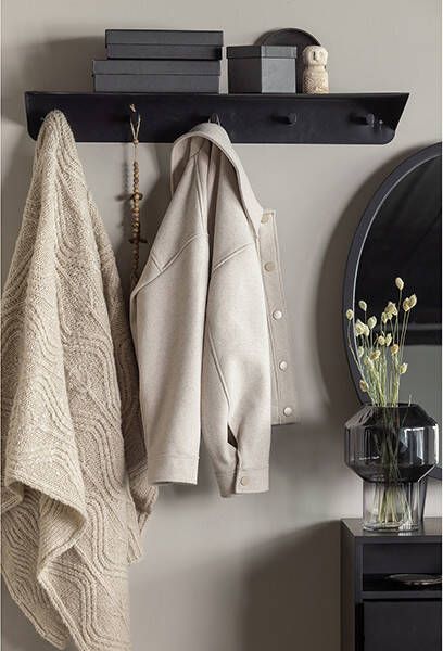 De WOOOD kapstok Kenan heeft vier haken en een praktische legplank. De haken kunnen ieder een gewicht dragen van 1 kg. Het maximale draaggewicht van de legplank is 2 kg, genoeg voor sjaals en andere accessoires. De metalen kapstok is afgewerkt met een zwarte poedercoating en afgeronde hoeken. De Kenan kapstok is ook verkrijgbaar met vijf haken. De afmeting van deze kapstok is (hxbxd) 10x60x30cm.